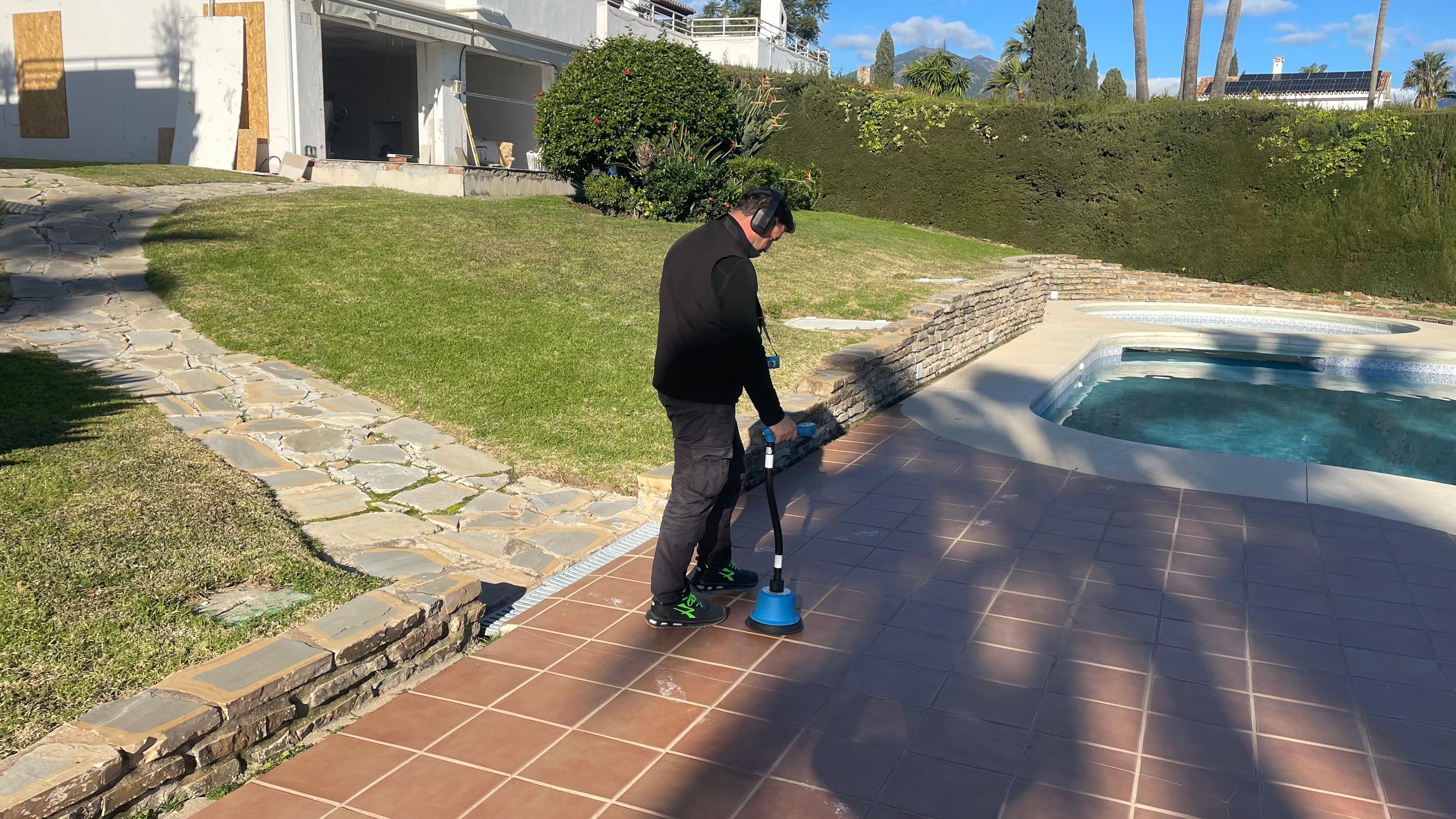 Rastreamos la superficie con el detector de gas trazador o el geófono acústico según la técnica aplicada, localizando con precisión el punto exacto de la pérdida.